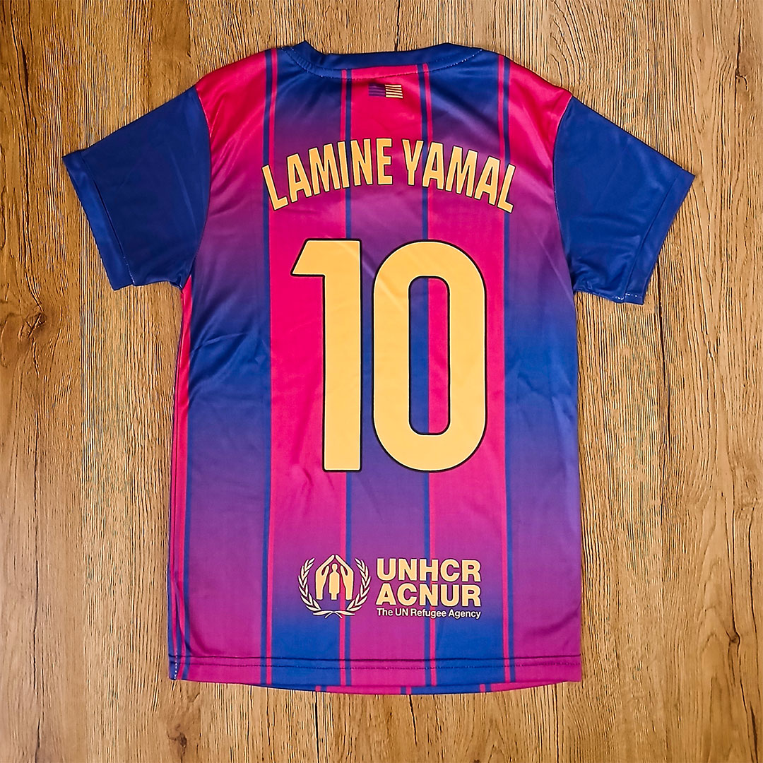 کیت فوتبالی بارسلونا : شماره ۱۰ بارسا یامال ، جنس پارچه سوپر فلامنت صاف که این جنس در برابر تغییر رنگ و آبرفت مقاوم بوده و به دلیل نداشتن پرز ضد حساست هست که مناسب کسایی که پوست حساس دارن
