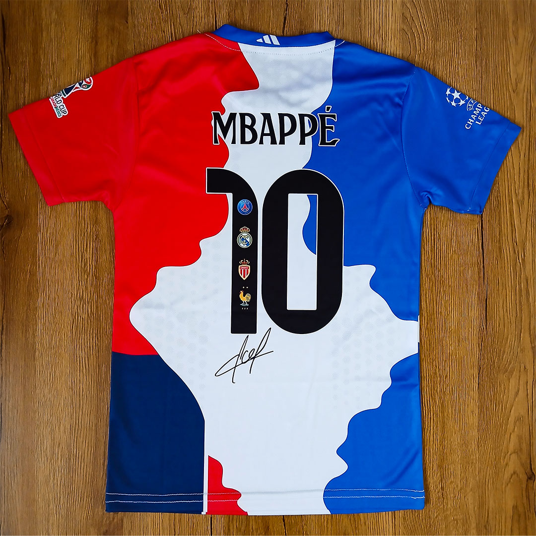 کیت فوتبالی منتخب امباپه: شماره 10 امباپه ، جنس پارچه سوپر فلامنت صاف که این جنس در برابر تغییر رنگ و آبرفت مقاوم بوده و به دلیل نداشتن پرز ضد حساست هست که مناسب کسایی که پوست حساس دارن